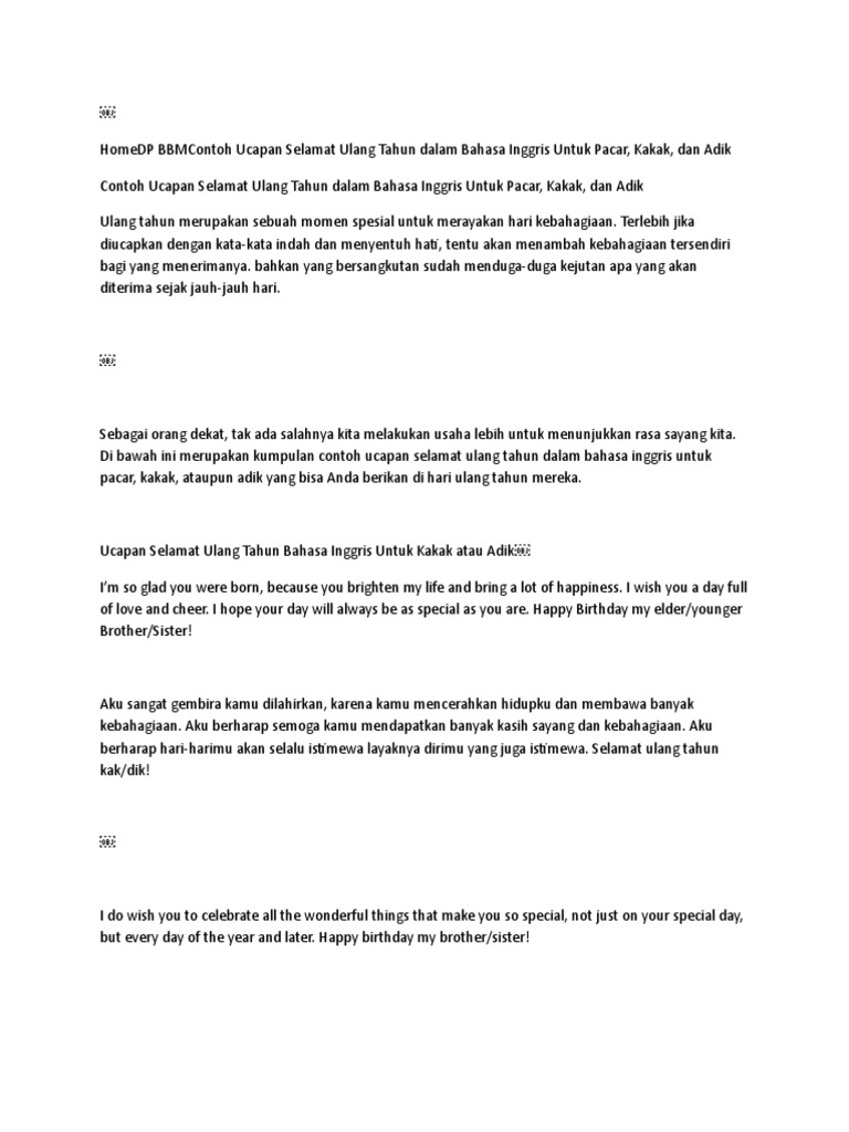 Jangan sombong dan tetap rendah hati. Jika ada yang ingin menambahkan atau memberi koreksi buat. Ingatlah kamu dahulu, sewaktu ayah memarahiku karena aku terjatuh dari motor dan membuat motornya rusak? Video ini aku persembahkan untuk kakak ku yang sedang ulang tahun. Ucapan ultah bahasa inggris dan artinya berikut dapat dipakai sebagai ucapan ulang tahun untuk sahabat, pacar, kakak, adik, orang tua, dan.